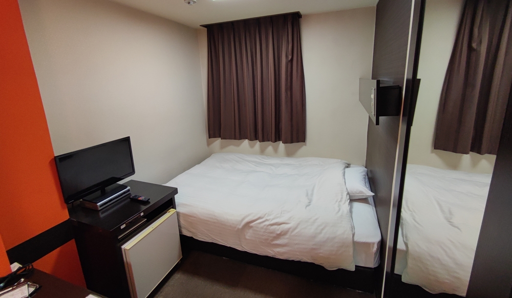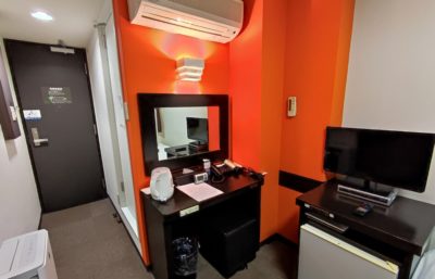 部屋のサイズにしては大き目な空気清浄機が配備されてまして、これが加湿器になるので助かりました。テレビは小さく STB 経由でアナログ接続されているので画質と音が悪いです。一部の BS と地上波が観れますが、テレ東系が観れなかったのでモーサテとか WBS が観れなかったですな。物を置くスペースがほとんどなくて、3泊するには若干窮屈でした。冷蔵庫は使わなかったので電源オフのままで。