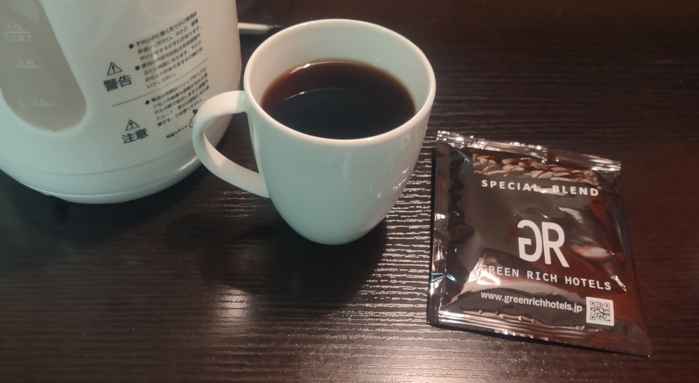 一応湯沸かしポットとカップがあり、フロントでドリップコーヒーが無料で貰えるので、コーヒーは飲み放題・・・でしたが、若干味が薄め。一度1カップに2つ分ドリップしてみたけど、若干濃くなったかな、程度でした。コンセントがアチコチにある点はグッド。椅子にキャスターが付いていると良かったかなぁ。