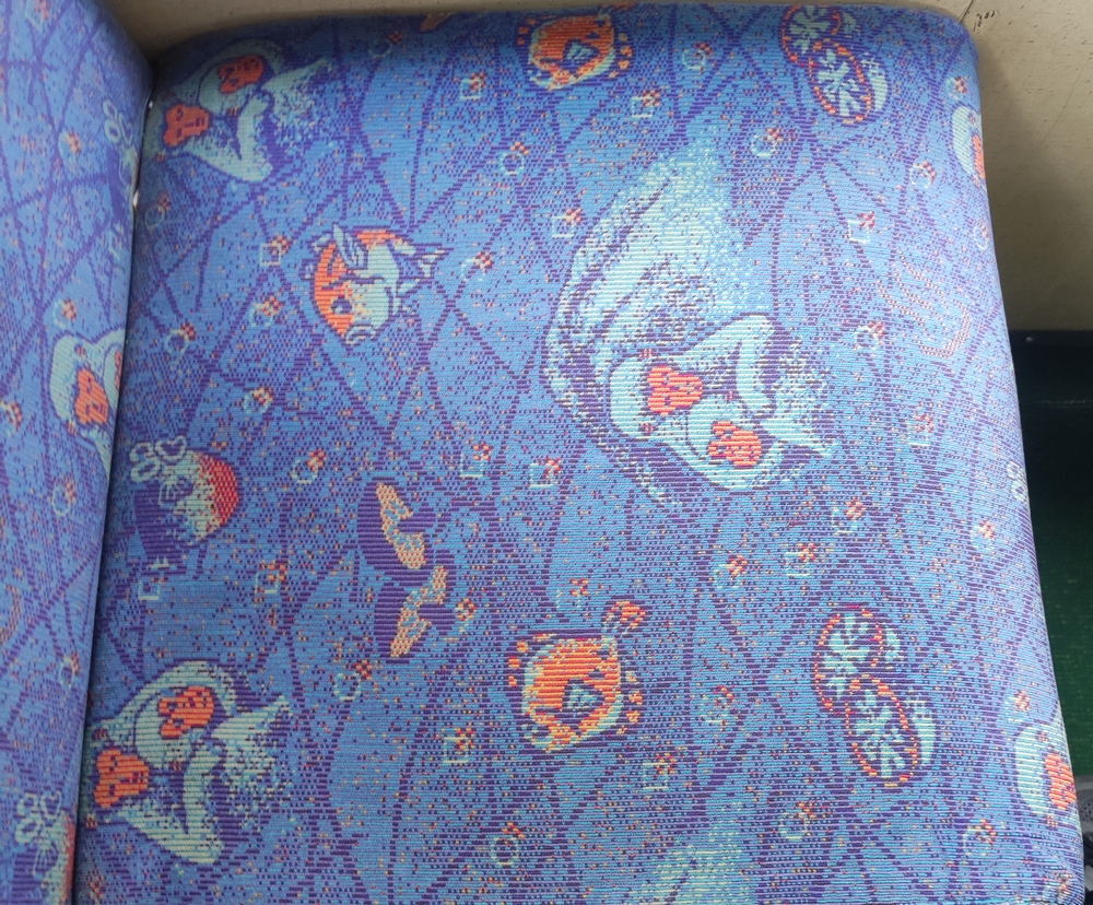 大分交通のバスは、シートの柄として大分名物が描かれてました(笑)。関さば、フグ、カレイ(ヒラメ?)、カボスに椎茸、猿は・・・温泉かな??