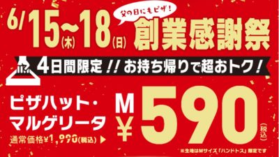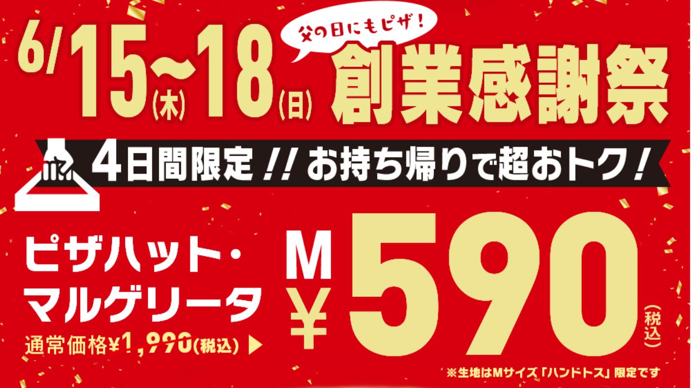 何やら4日間限定で創業感謝祭とかでMサイズが590円だというのです。生地もトッピングも選べませんが、マルゲリータが 70% オフって、なかなかな太っ腹企画です。久しくピザ食べてないし、乗せられてみました(笑)。