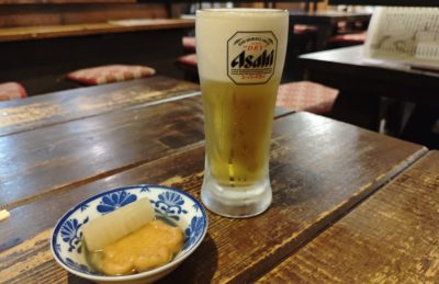 お通しがおでん。とはいえ、まだ暑い日だったのでビールが美味いな状態。