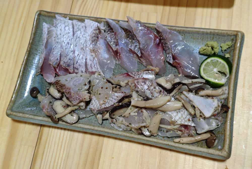 日本酒に合わせるお魚は天然真鯛の塩すだちカルパッチョと3種のキノコのマスタードマリネ。キノコがウマイ・・・秋ですな。