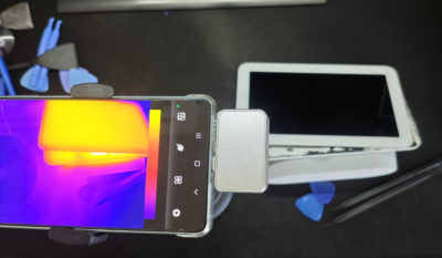 Google Nest Hub の画面交換は、テープで接着されている画面を取り外す必要があるということで・・・久々登場のヒートガンで温めてテープを溶かしてこじ開けます。どの程度熱くできているのかわからないので、サーマルイメージャーで見ながら慎重に実施しました。