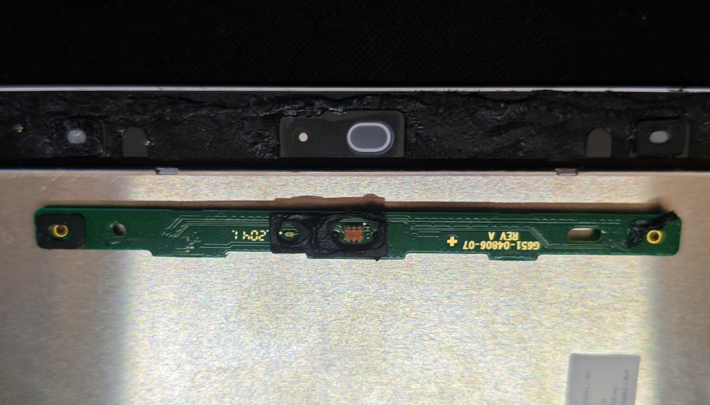 センサーボードは画面側に接着されています。何やらスイッチみたいなのが中央にありますが・・・コレは画面背面上部にあるミュートスイッチと連動するようになっているようです。