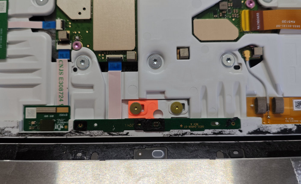 リボンケーブルの1本はディスプレイとの接続で、もう一つが画面上部のセンサーボードへの接続でした。分解してみてわかるのは、画面上部はセンサーボードがあるので粘着テープを溶かしたり、スパジャー突っ込む際には注意が必要ですかね。それいがい、下側や左右のエッジはそこまで注意しなくても大丈夫そうな造りしています。