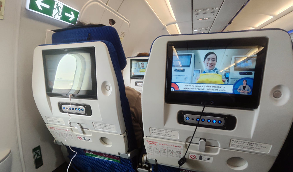 小さ目ながらタッチパネル対応のシートモニターがありました。フライト時間が短いので映画とかは無理。非常口があるシートだったので、足元がユッタリでした。