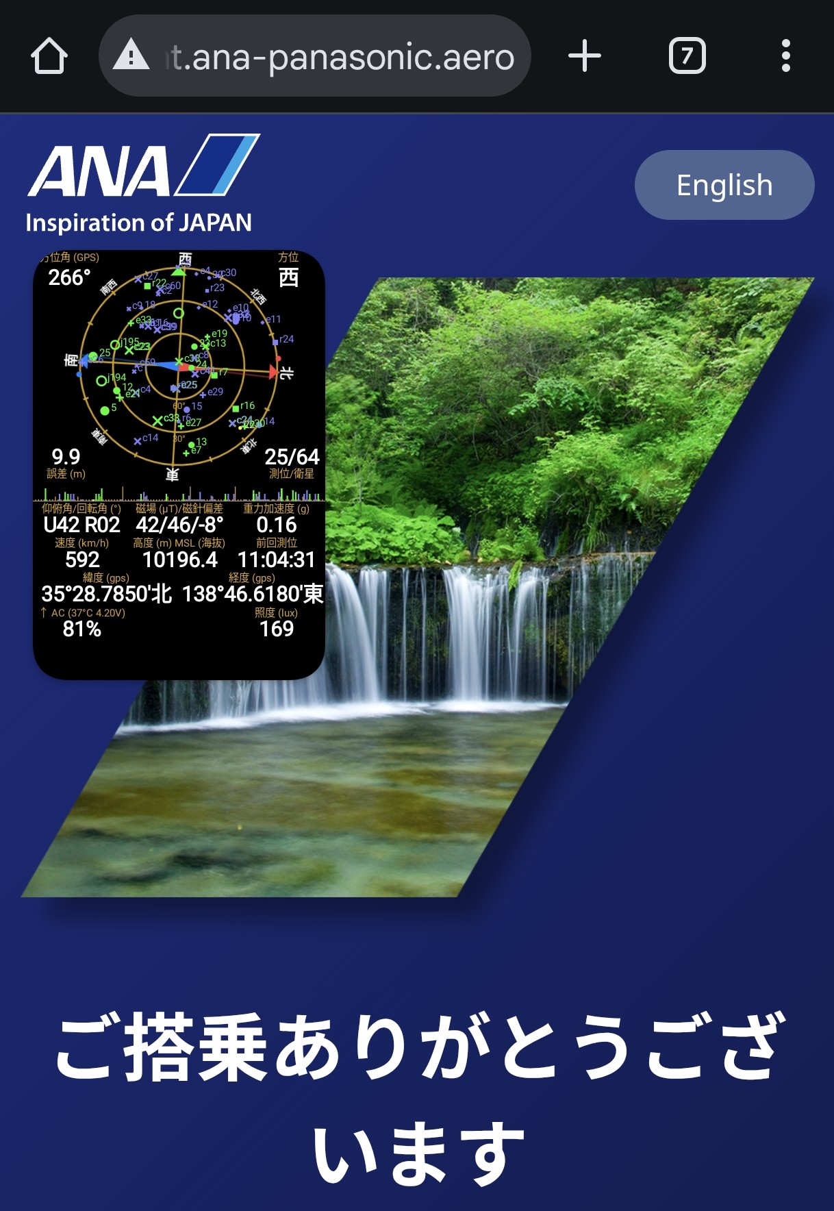 機内 WiFi でネット接続も可能でした。速度測定すると、結構良い数値が出るのですが・・・使っているアプリ上での反応はパケ詰まり頻発でモッサリって感じでした。とはいえ、ちょっとした動画閲覧くらいできる感じではあるので、使えるだけありがたい。とはいえ、往路はなぜかネット接続可能になるまで結構時間かかって、富士山付近まで行ってやっと接続可能に。そして、京都過ぎたあたりで早くも降下モードになって接続が切れましたので、利用可能な時間が短かったです。