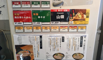 メニューは少な目で、主に鶏白湯と鶏そば、限定でトンコツな山嶺(ITADAKI)の3種類。
