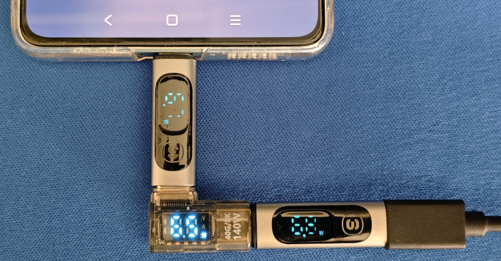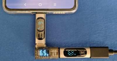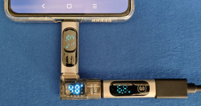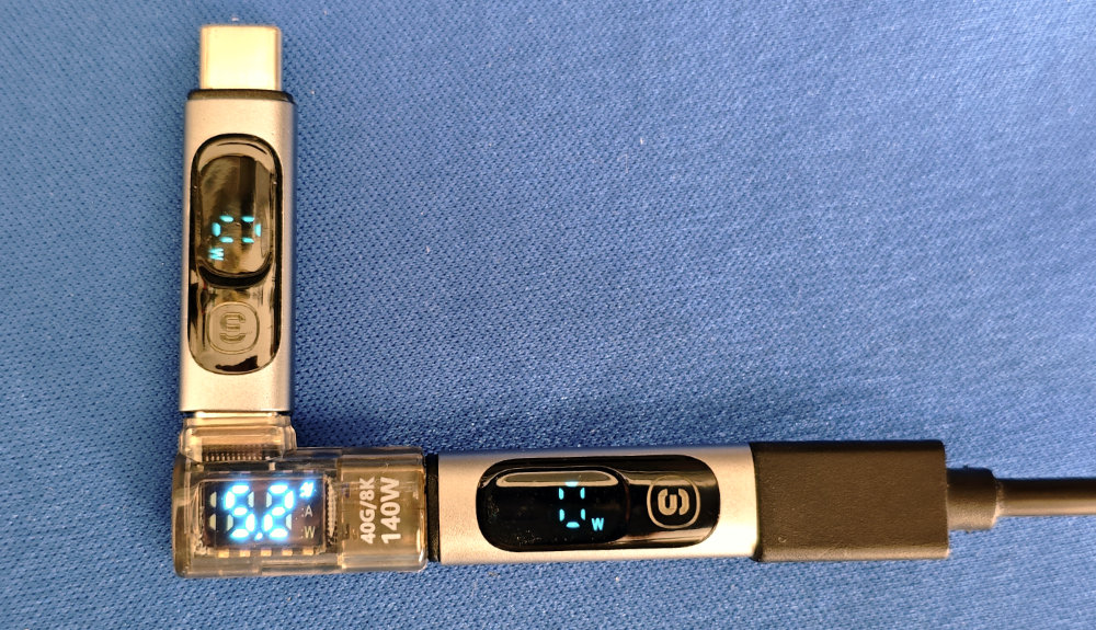 USB Type-C を L 字に変換するアダプタでありつつ、電力チェッカー機能が付いたブツです。ポチった後に出てきたコチラの記事で気付いたのですが・・・サンワサプライが1,180円で販売するブツと見た目が全く同じ(爆)。OEM 品というか、サンワサプライが設計・製造していない、アリモノを仕入れて日本で販売しているブツと思われます。アリエクならワタシの購入時で $1.86。色々割引適用してワタシは $0.46 で入手しているので・・・ほぼタダみたいなもんです(笑)。
