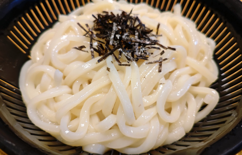 うどんは冷たい派ですし、ぶっかけうどんにするための具材もなかった(揚げ玉とネギ、温玉くらいで良かったらしい)ので、冷やしざるうどんにしました。刻み海苔だけ追加(笑)。