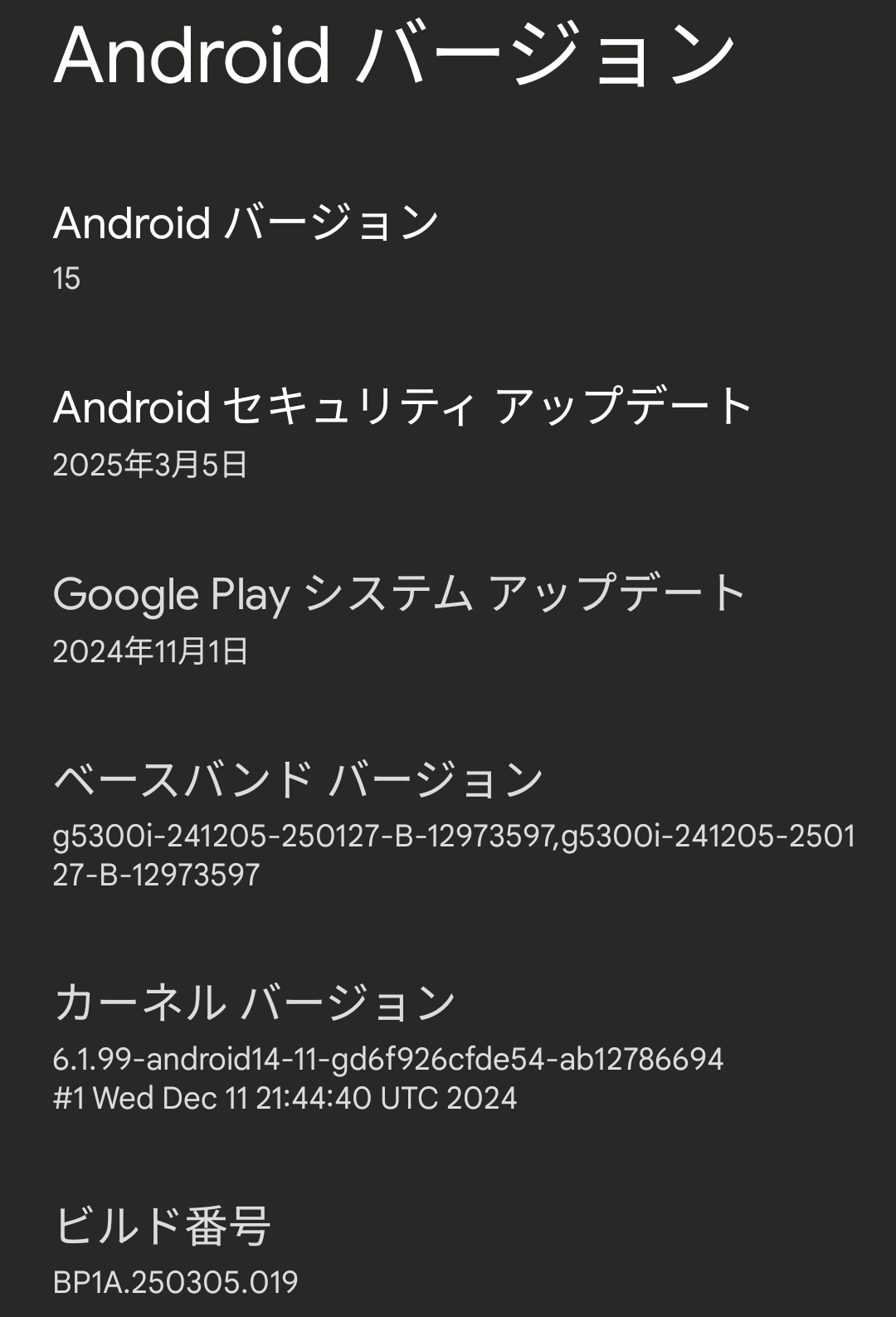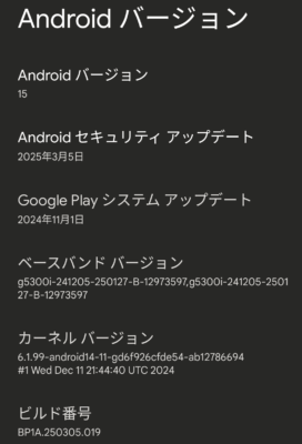 入手した状態では Android 15 でした。日付も今年の3月くらいで止まってましたので、使用しなくなってからしばらく放置されていたものと思われます。