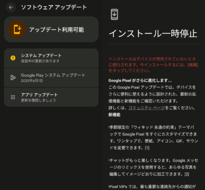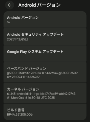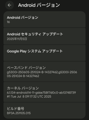 オサイフ関連などをチェックしていたら、更にアップデートが来ていました。Android 16 になった時点でのセキュリティアップデートが10月モノだったので、追加更新はあるだろうと思っていましたが・・・やはりありました。セキュリティアップデート以外にも色々と機能追加があるようです。Google Pixel の良い点は、こうした Android の最新機能がどんどん降ってきて進化を楽しめるトコロでもあります。