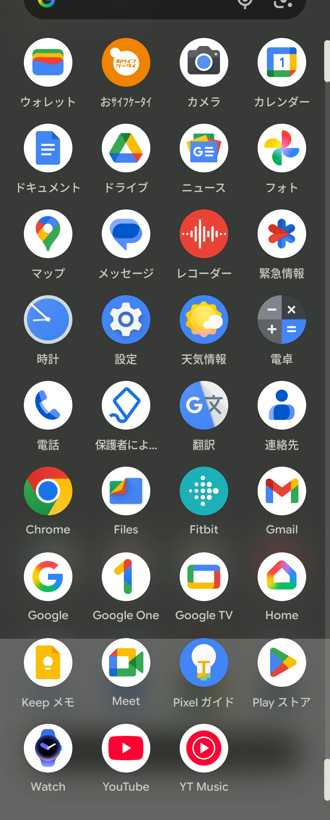 アプリを追加したら、一気にアプリドロワが埋まりました。Google 関連だけでも結構あるもんですな。Pixel Watch や Fitbit は使っていないのでワタシには不要ですが、それ以外は割と使うモノだったりするので仕方ないですな。