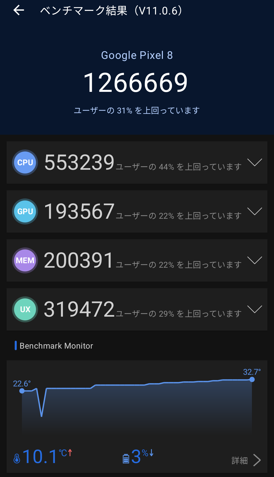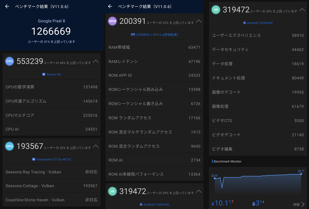 ココの一覧だと、V11 系で最新の Pixel 10 Pro (Tensor G5) で166万、Pixel 10 (Tensor G5) なら140万、Pixel 9 (Tensor G4) で155万、Pixel 8 (Tensor G3)で117万という結果らしいので、OS バージョンとか測定環境が違うと思われる他の人の Pixel 8 よりも良いスコアが出たし、より新しい Google Pixel と比較してもそれほど劣っている感じでもないですな。とはいえ、Google の Tensor 系は Antutu のスコアはあまり高くなくて、Snapdragon 8 Elite とかだと300万オーバーというのもあるので・・・あまり目安にはならんかも。