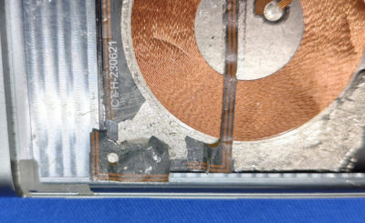 背面パネルは除去できましたが・・・無線充電のコイルと NFC アンテナのモジュールがダメージを受けました。背面パネルはフレームの外周に沿って接着されているんですが、この無線アンテナユニットも全体的に背面パネルに接着されていました。コレがなかなかうまく剥がれなかったのです。かなり慎重に加熱してスパジャーを入れていったのですが・・・背面パネルのガラスが「パキッ」と割れたタイミングで、NFC アンテナも切れてしまいました。なんとか一部だけで・・・と粘ったのですが・・・