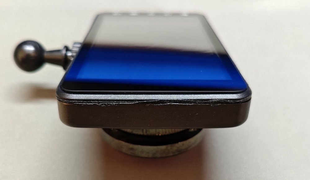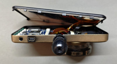 最初は内蔵されたバッテリーが膨張して押し出したのかとも思ったけど、若干膨らみはあるものの液晶画面を押し出す程に膨れてはいないので・・・単純にプラスチック部品の劣化が原因っぽい。リアガラス越しとはいえ、長年直射日光にさらされてたら仕方ないかな。