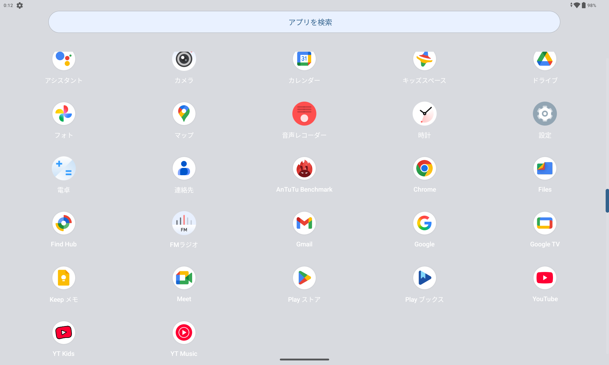 設定変更してアプリドロワを表示するようにした方が一覧で見やすかった(笑)。コレに気付いたのが Antutu インストール後だったので、Antutu 以外がデフォルトで入っているヤツです。不要なモノは少な目ではありますが、YT Kids とかキッズスペースとか、子供用タブとして活用することを考慮したかのようなプリインストールが気になりますね。コレは一度不要アプリのお掃除をした方が良さそう。