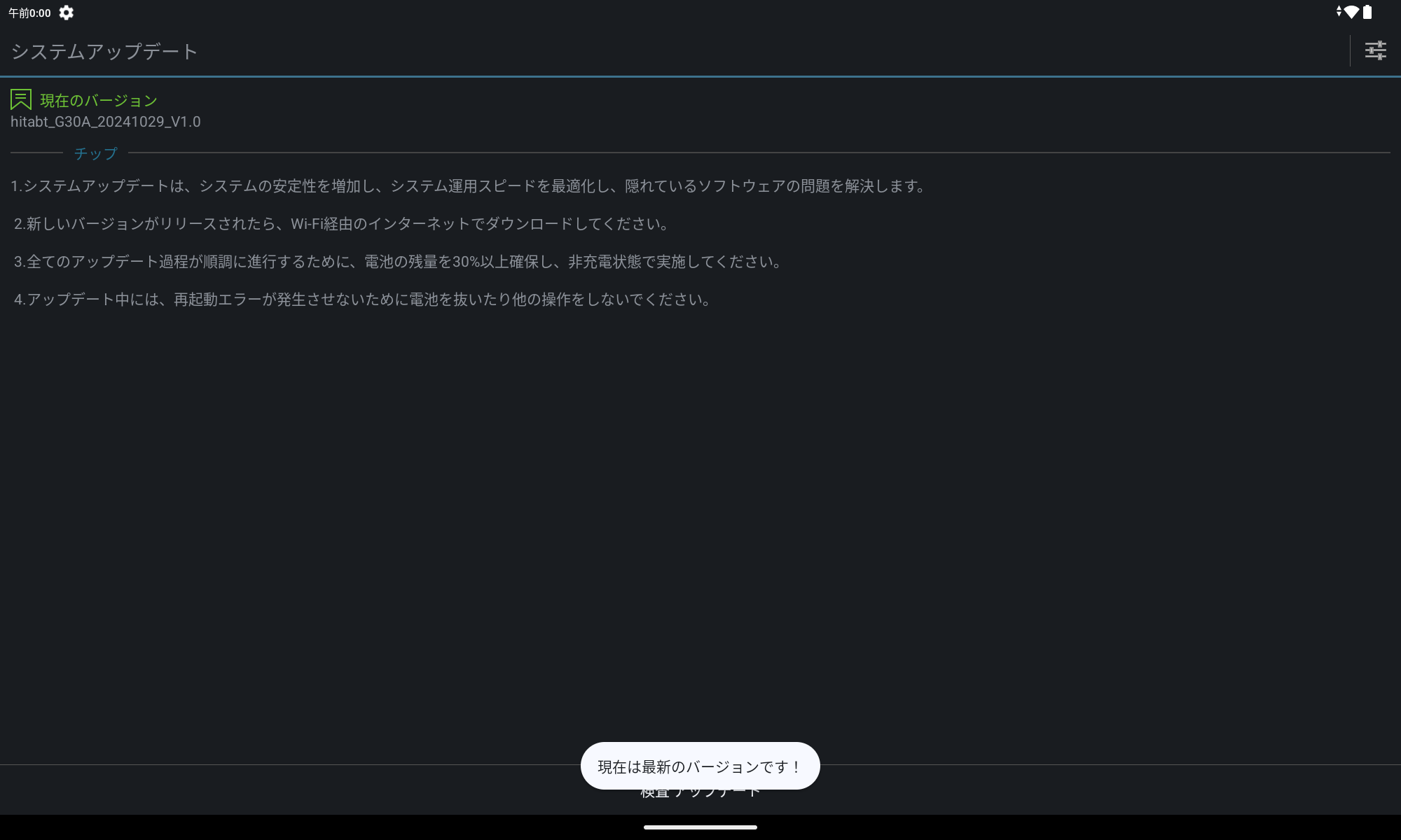 恐らくは・・・と思った通り、アップデートは全く降ってこない感じです。セキュリティアップデートも配信されないのは、この手の中華端末では良くあることですよね・・・。Android バージョンが上がらないのは仕方ないとして、セキュリティアップデートは欲しいトコロですが、そんなサポートが全く期待できないのが中華端末のコワイところ。