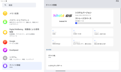 RAM は 8GB ですが、メモリ拡張がデフォルトで追加されてて +16GB となっています。用途によってはオフにした方が良いでしょう。hitabt OS という謎のロゴがありますが・・・基本的にはスッピンの Android って感じです。