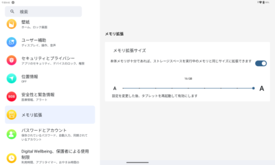 メモリ拡張の ON/OFF と、拡張サイズを設定できますが・・・サイズ設定のスライドバーがフォントサイズ変更のヤツを流用してる感じなのがジワジワきます(笑)。