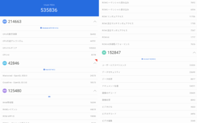 古い端末ですが、ハイエンドなタブレットだったこともあってか、Kirin 980 搭載な MediaPad はなかなか良いスコアです。2019年頃の端末なので・・・当時のハイエンドだった Xperia 1 (Snapdragon 855) と近い感じですかね。MediaPad の測定は色々アプリとか入った状態で長年使った状態のままです。リセットしたら、もうちょっと良いスコアになるかも??