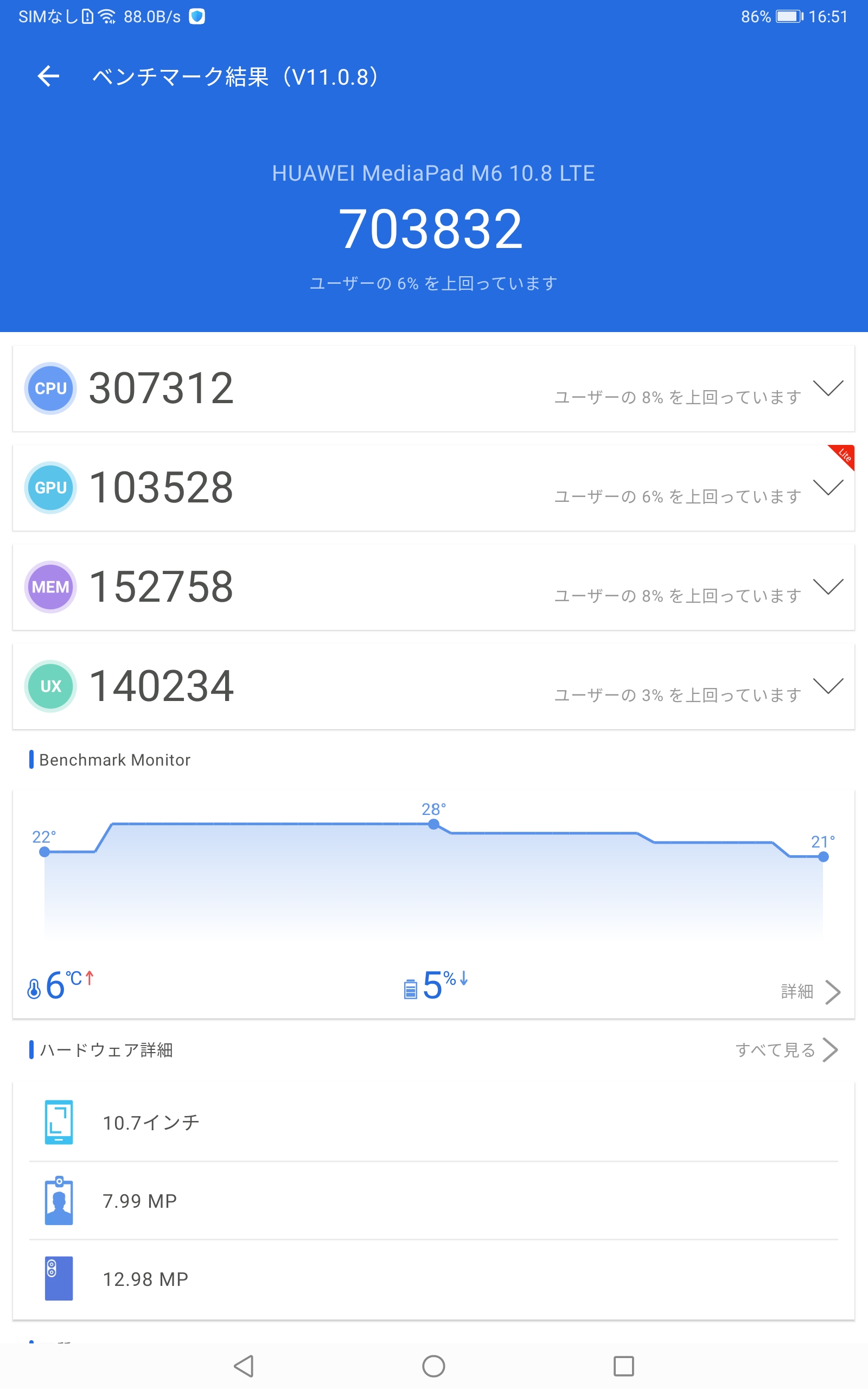 置き換え対象となる HUAEWI MediaPad M6 の Antutu データを探してみたら・・・発見できず。どうやら、当時 Antutu はインストールしたものの、最後まで完走しなくて諦めていたようです。というわけで・・・最新 V11 で再挑戦(笑)。