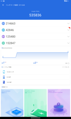 測定時の最新版(V11.0.8)で測定すると・・・トータルスコアは 535,836 ということで、確かにエントリースマホの上位か、ミッドレンジの下位程度のスコアとなりました。同じく MedaTek な Jelly Max の70万より低めなのは、やはり Helio より Dimensity の方がハイスペックというコトですかね。とはいえ、Dimensity 7300 とは CPU スコアはほぼ同等で、GPU スコアの差が大きいみたいですな。・・・と、ここで Jelly Star が同じく Helio G99 搭載であることを思い出しました。Jelly Star は (V10 だけど)スコアは41万だったので、今回のタブレットの方がスコアが良い。
