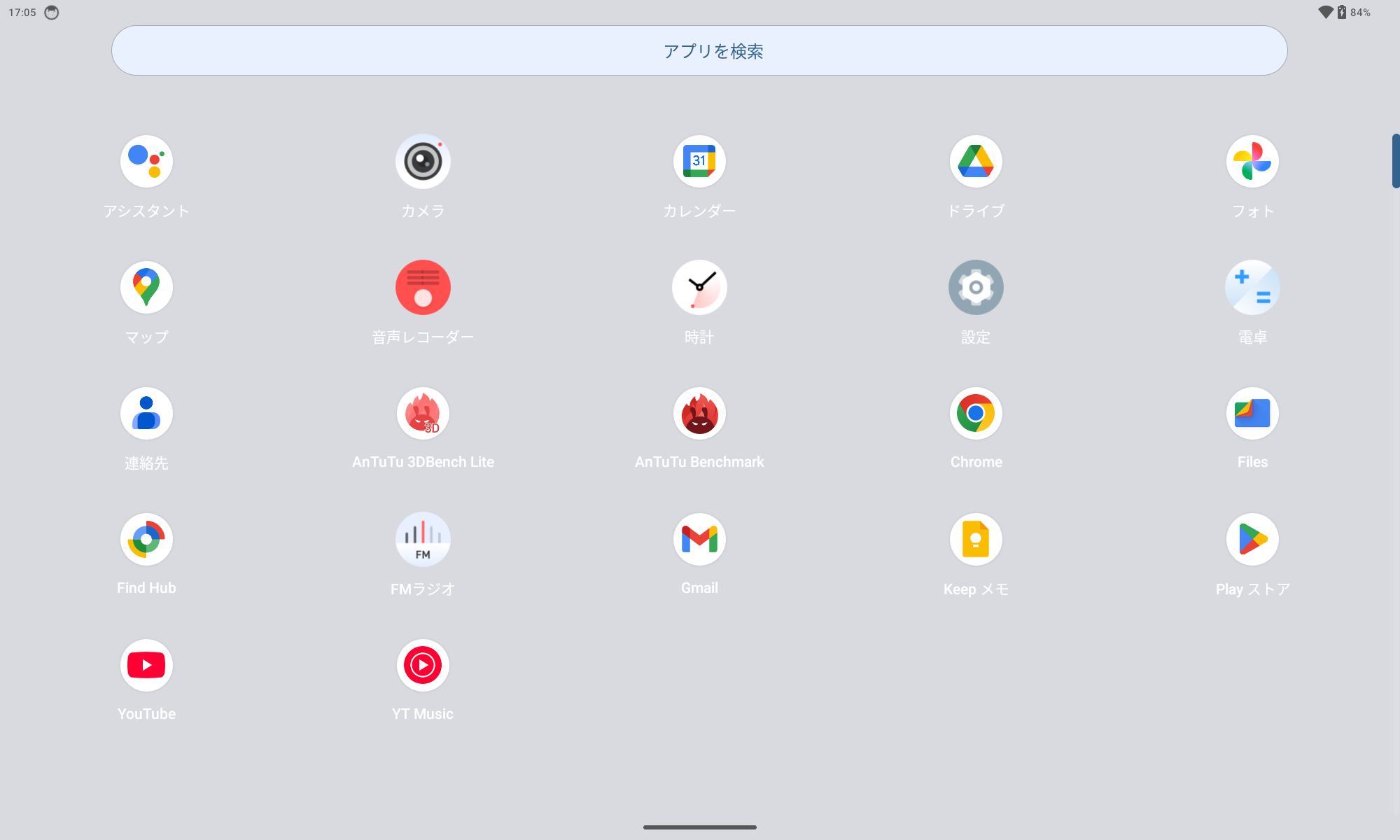 アプリドロワもスッキリ。不要になった Antutu は消しても良いし、持ち出さないので Find Hub とかも消しても良かったかも。ベッドサイドには Google Nest Hub もあるので、Google アシスタントも実は不要だったりするけど、一応残しておきました。他のスマホ等とは別 Google アカウントで運用するので、実は Keep とか Google Drive、YT Music、連絡先やカレンダーも実は使わない可能性が高いけど・・・あまり消し過ぎるのも気が引けたので若干残しています。