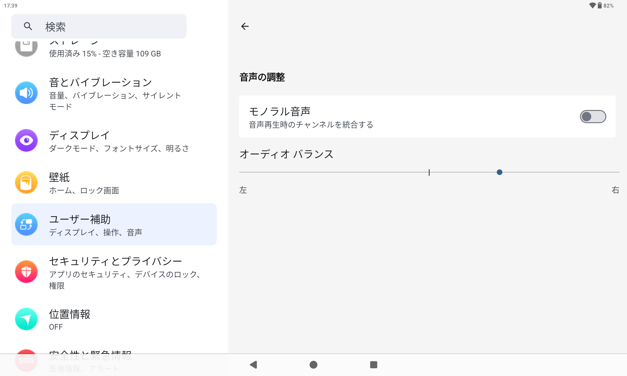 基本は動画視聴端末なので、音はどんな感じか・・・と試してみたら、横向き画面にしたら、左右のエッジからステレオ再生されるのは良いのですが、結構左側の音量がデカイ。バランスが悪いというのは、Amazon のレビューにも書かれていましたので個体差ではなさそう。ユーザー補助のオーディオバランスを上の画像な感じで調整したら、ちょうど左右のバランスが良くなりました。
