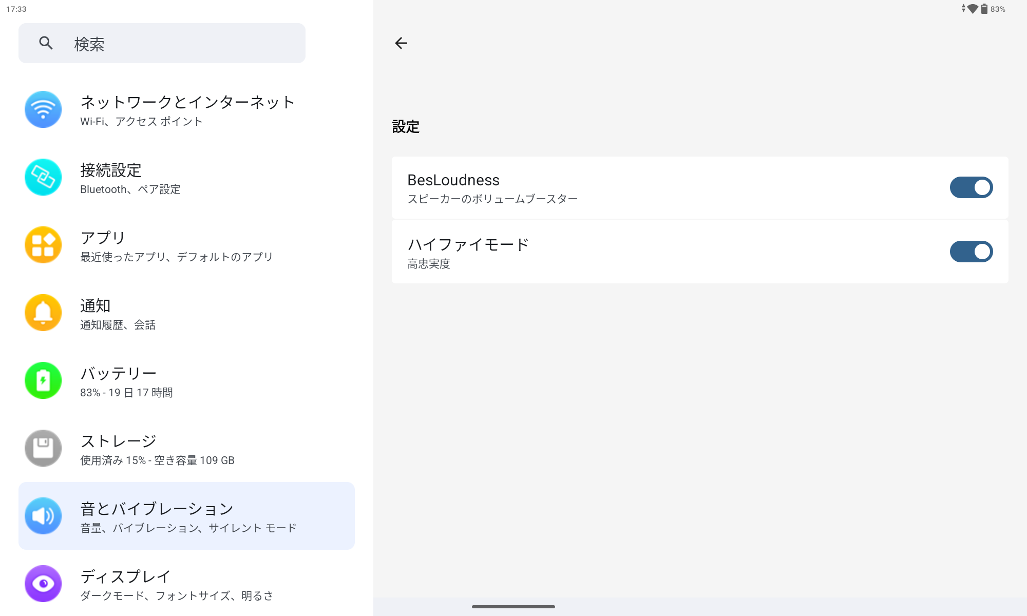 スピーカーからの音質は、そこまで酷くはないけど上質って程でもないですね。前任機の MediaPad が Harman Kardon 監修の4スピーカーシステムだったりしたので、比べちゃうとだいぶ劣化した感じになります。一応音質に関する設定が2つほどあって、デフォルトで両方 ON になっていたのですが・・・OFF にすると更にショボくなるのが確認できますので、ON のままで使うべきですな。まぁ、大音量で聴くわけでもないので、このタブレットのスピーカーでもギリ大丈夫かな、というレベルです。