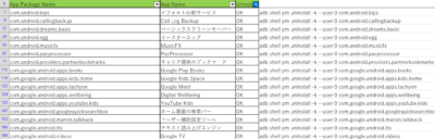 「adb shell pm list packages」でパッケージリストを抽出してからアンインストールできそうなヤツを選んでみたトコロ・・・実はそれほど不要なヤツはありませんでした。POCO F6 のお掃除と比較してもかなり少な目。Google の特に使わないヤツを消した程度で、コレといってアヤシイものはありませんでした。