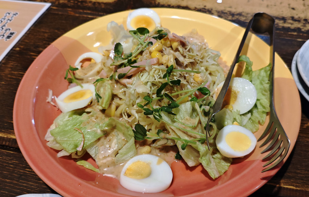 まだまだ腹ペコというT氏のためにラーメンサラダ。ワタシは既にイイ感じなので、野菜だけちょっと摘まんだだけなので・・・ほぼT氏が一人で平らげました(笑)。