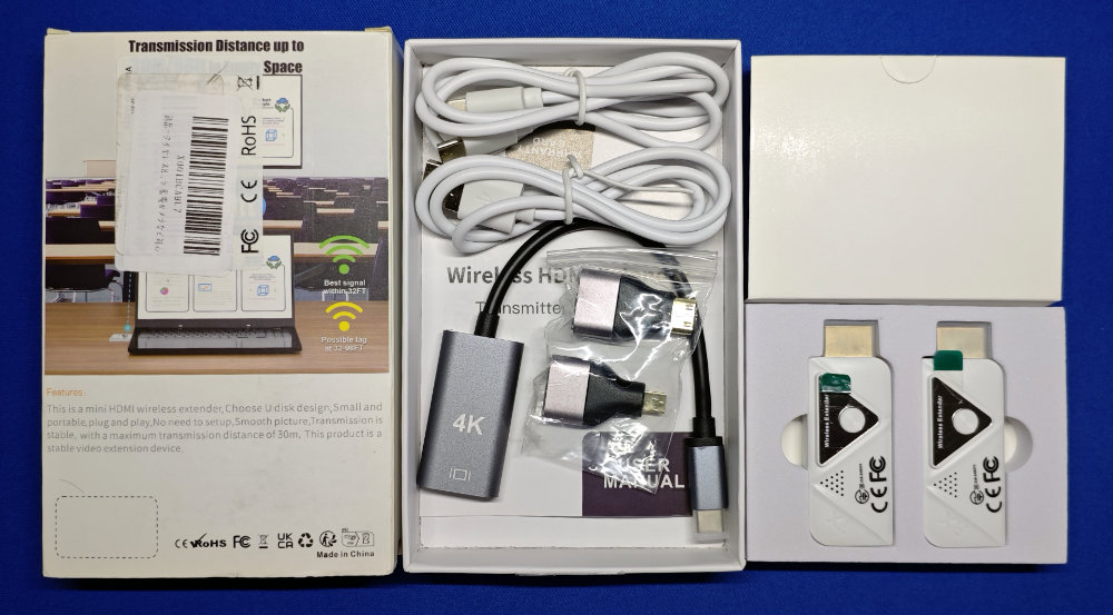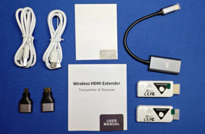 このパッケージには、送信機・受信機以外に付属品が多数。電源補助(HDMI からの電源だけでも動く場合もあるらしい)用の A to C の USB ケーブルが2本。コレは標準で入ってるのは理解できますが、それ以外に通常 HDMI を mini HDMI、micro HDMI それぞれに変換するコネクタと、Type-C から HDMI に変換する尻尾まで付属。変換系は完全にオマケですが、割と色々な用途で困らないだけの付属品です。あとは説明書と保証書。
