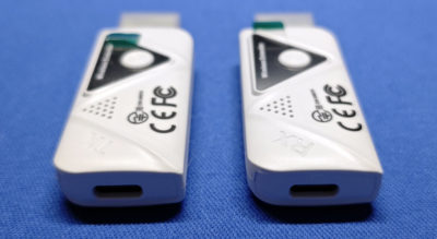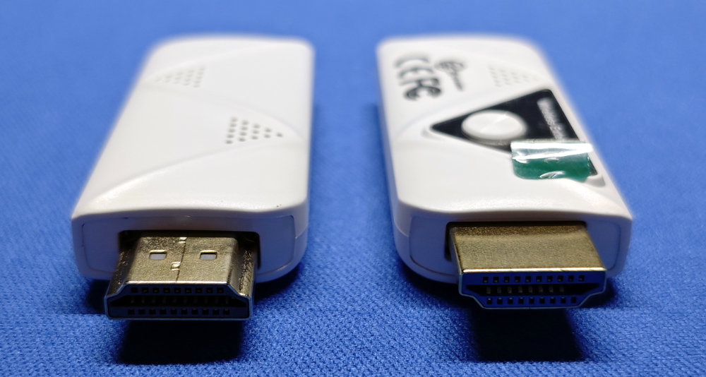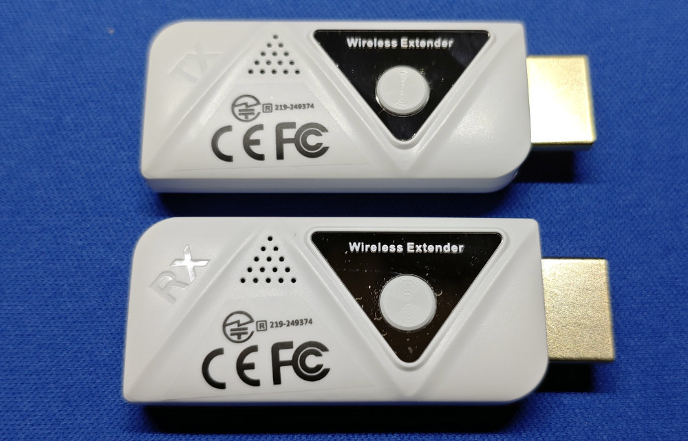 本体は TX と書かれた送信機と RX と書かれた受信機がそれぞれの役割を担います。HDMI コネクタの反対側には電源用の Type-C コネクタ。この手の HDMI 無線化ガジェットでは、消費電力が大き目で、5V 1A とか 2A といった感じで結構な大電流を要求するブツも多い中、このブツは結構省電力で動作するっぽいことがレビューにあったのが手を出した決め手。仕様上では見開き空間で50mほど飛ぶらしいけど、そんなに長距離飛ばす気はないのです。また、コレ用に別途個別の電源を用意したくなくて、宗氏側・受信側にある USB ポートの少ない出力でも動作するのが理想的。