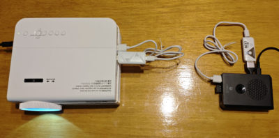 お試しにラズパイからプロジェクターに飛ばしてみました。それぞれの USB ポートからの給電で十分動作しています。遅延も気にならないくらい。ラズパイの HDMI ポートは micro なので、付属の変換アダプタが役に立ちました。