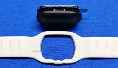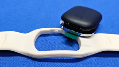 本体とバンドを固定する溝の奥にボタンがあります。シリコンバンドを装着した状態でも押せるようになっています。オペレーションは全てこの1つのボタンで行います。