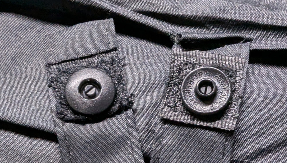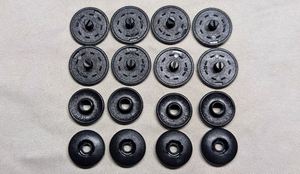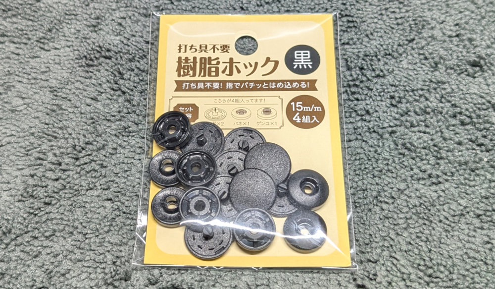 ベルクロを張り替えようかと思ったのですが、またボロボロになるのもイヤなので・・・セリアでスナップボタンで縫わなくて良いはめ込み式(工具不要)のヤツを買ってきました。ダイソーだと黒が品切れだでした。サイズも3種類くらいあったけど、一番大きいヤツ(15mm)をチョイス。