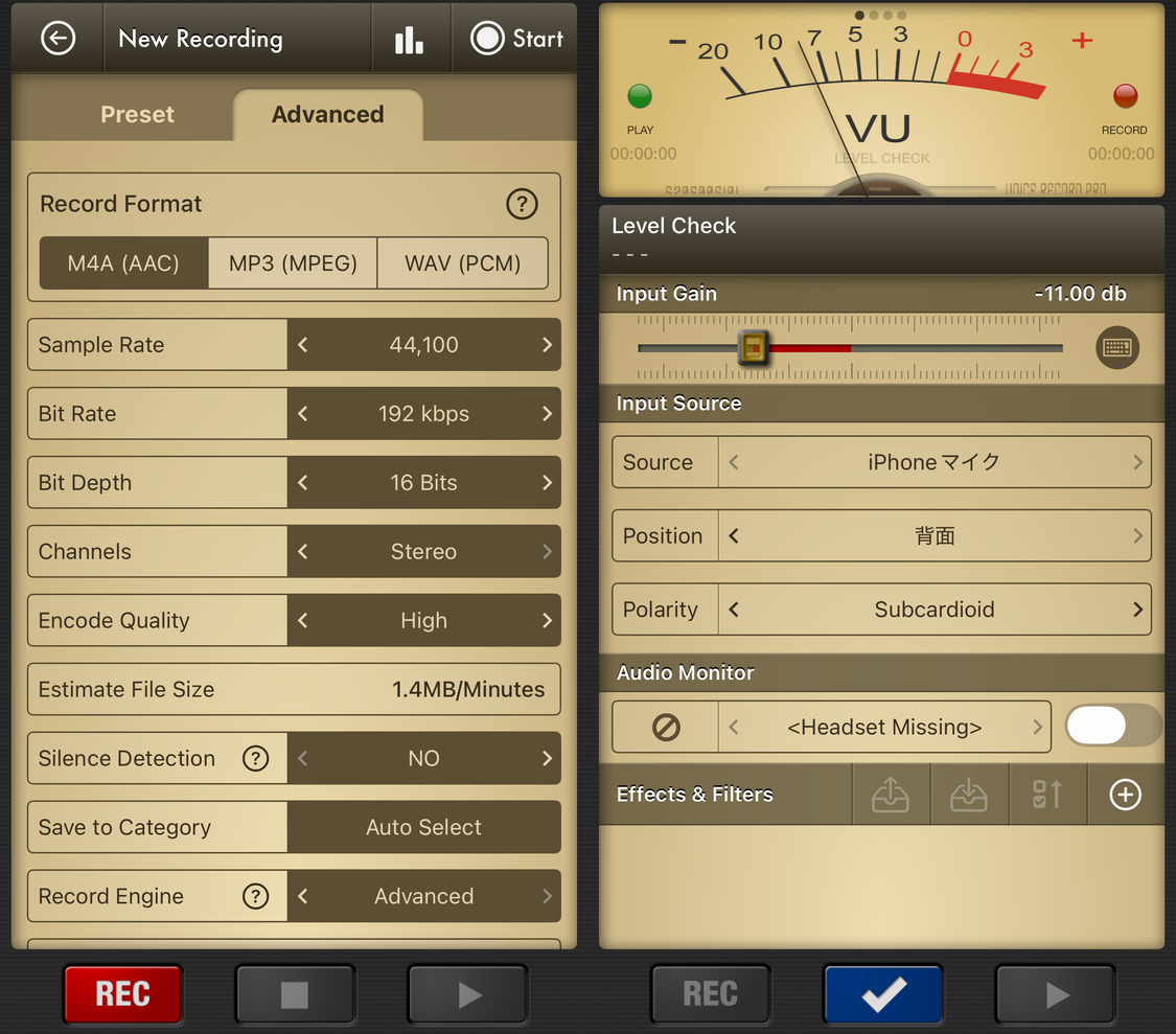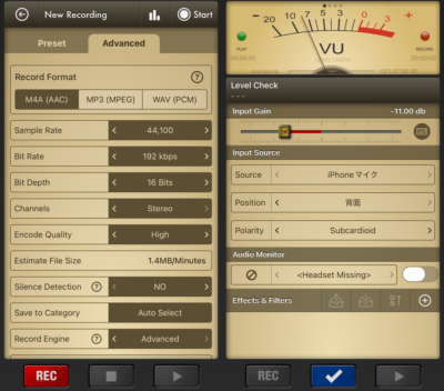 もう1台、iPhone 11 Pro にもアプリ入れて録音してみました。コチラは Voice Record Pro というアプリを使用しまして・・・コレもバックグラウンド動作とゲイン調整ができるのがウリ。iPhone は上着の胸ポケットに入れて、背面側を前に向ける感じ。なので、録音設定は Position を背面を指定。縦向き配置になるので、ステレオよりも向き重視で Polarity を Subcardioid を指定しました。しかし、コレが失敗だったらしく、録音結果を聞いたらプチプチとノイズが入ってしまいました。