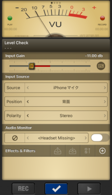 このアプリ、バックグラウンド動作可能なので録音続けながら写真撮影とかできちゃうのも便利だったんですが・・・ライブ後半に動画撮影を長時間したら、途中で録音が停止しちゃっていました。どうやら短時間なら OK だけど、長時間バックグラウンド動作したままだと復帰できずに終了しちゃうらしい。コレは iOS 側の制限かも? 動画撮影の後に録音が停止したことに気付いて、慌てて別ファイルで録音をスタートしたら・・・Polarity がデフォルトの Stereo になってしまったのですが、逆にこの設定だとノイズなく録音できていました(笑)。怪我の功名ってヤツですな。また、このアプリでもゲインを -11.00db としたのですが、減らし過ぎだったかも。