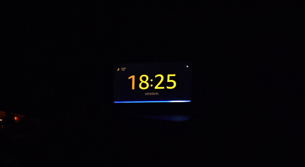 周辺が暗くなると画面表示もかなり暗くなのですが・・・コレ、暗くなりすぎて時計も良く見ないとわからない状態。ベッドサイドに置くならアリですが、リビングに置く場合ではイマイチ。そして、暗い状態で呼びかけても画面が暗い状態のまま音声読み取り状態を示す青いバーが出ます。上の写真だと・・・カメラの補正でだいぶ明るく見えるけど、実際には読み取りモードになったかどうかも判断が難しいくらいに暗いのです。せめて呼びかけたら、画面明るくしてくれ・・・と思います。Echo Dot だった時は、周囲の明るさで挙動が変わらないので、結構明るい青ランプで読み取り状態になったことが認識できていました。まぁ、認識モードに入ったかは気にせず指令を出せばイイだけなんですけど・・・ちょっと不満。