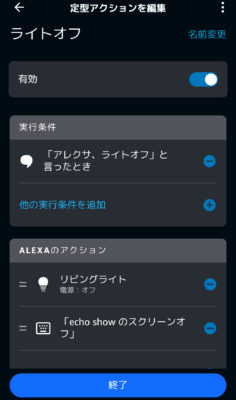 一応消えたままになる確率が高い方法を発見しました。それは、他のアクションの最後に「スクリーンオフ」の指令も添えておくこと。すると、画面消灯のままになる確率が高かったです。ダメな時もあるし、コレでもしばらくすると点灯しちゃうので気休めですが・・・この方法を見出してなかったら、利用停止して返品してたかも(笑)。