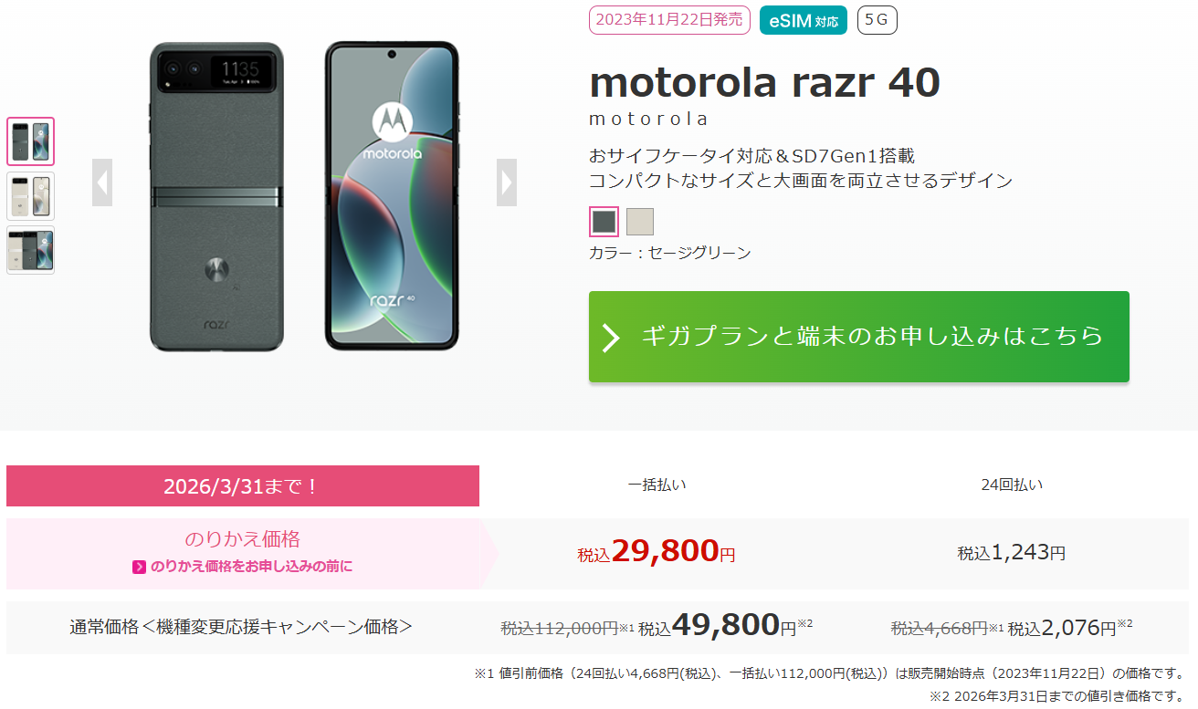motorola razr 40 が30,000円引きとなるそうで・・・MNP 特価な 29,800円よりもお安くゲットできるらしい。閉じた状態で操作できる画面がないのが若干気にはなるけど・・・ちょっと Fold 系スマホ試してみたいから、コレはありかも⁉