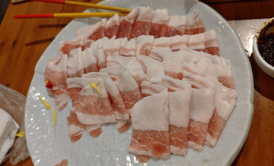 食べ放題なので、お肉等は別途注文できるんですが・・・最初に出されたお肉、どうみても2人前じゃないです。通常のコースだとバラ肉(上の写真の手前側)とうで肉(奥側)が各200gだというのですが・・・確実に3倍以上が最初から盛られています。結構食べてお腹程よいね・・・というタイミングで上の写真。まだ半分くらい残ってます。
