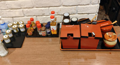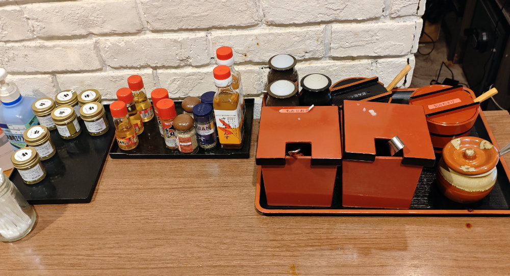 テーブルにあるタレ以外にも、薬味ステーションに色々あります。ラー油、もみじおろし、にんにく、わさび等々。