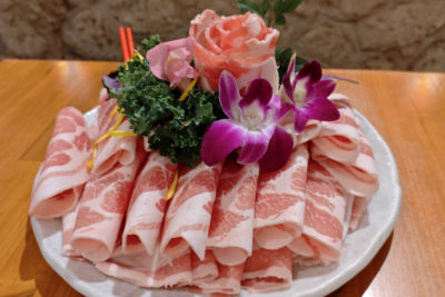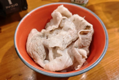 こちらが最初に提供されたアグー豚。モリモリです(笑)。ちなみに・・・「あぐー豚」と「アグー豚」は別物らしく、カタカナの方が純血種で希少らしい。せっかくなので、今回はアグー豚を取り扱うお店を選びました。