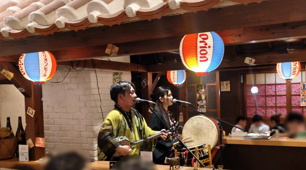 食後のマッタリタイムな頃に、ステージで三線の生演奏が始まりました。「オジー自慢のオリオンビール」初めて生演奏で聴けました♪ 既にビールで乾杯という腹具合ではないので・・・ノリノリってワケにもいかずマッタリと・・・。