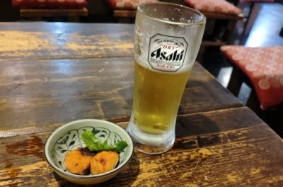 お通しの鮭をツマミつつビールで乾杯。歩いて少し暑くなってたのでビールが染みます♪
