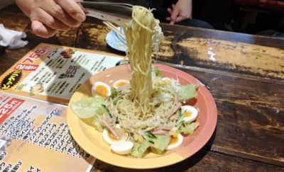 結構食べているのにまだ腹ペコだというT氏用に、毎度お馴染みラーメンサラダ。珍しく麺リフト(笑)。