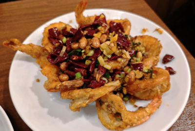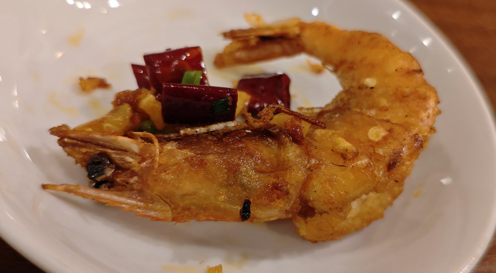 今回初挑戦な殻付きエビの香り揚げ唐辛子炒め(1,500円)。エビが10尾もあってこのお値段。見た目は唐辛子タップリで辛そうですが、メニューの辛さレベルは3段階中の1の「ピリ辛」。殻を外して食べるものかをオーダー時に確認したところ、殻ごとバリバリ食べて OK だそうな。