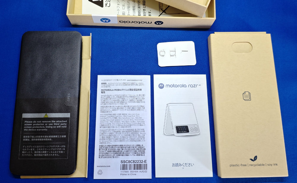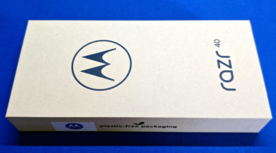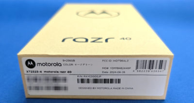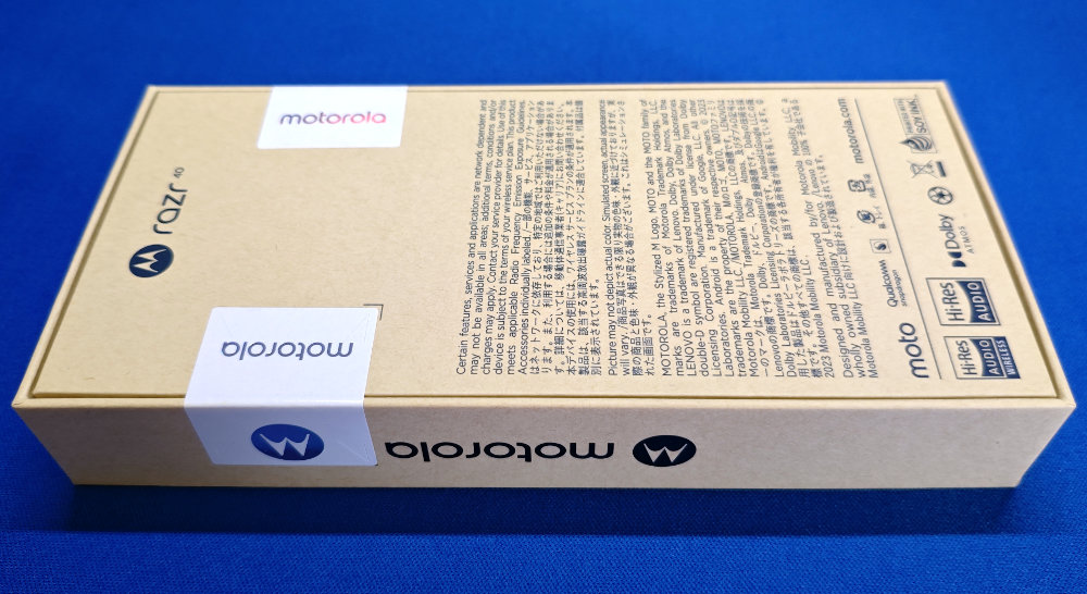 気を取り直して IIJmio から届いたナカミ。発注時のポストの通り、razr 40 とモバイルルーターを発注していました。モバイルルーターについては・・・また追々。razr 40 の箱はスリムでエコ重視って感じなパッケージですな。